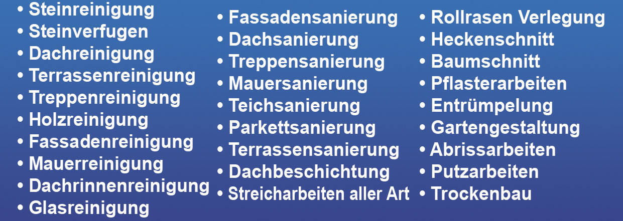 Für unsere Kunden reinigen wir Terrassen, Höfe, Eingänge und Wege. Auch Ihre Zufahrten, Garagen und Parkplätze lassen wir im neuen Glanz erstrahlen!